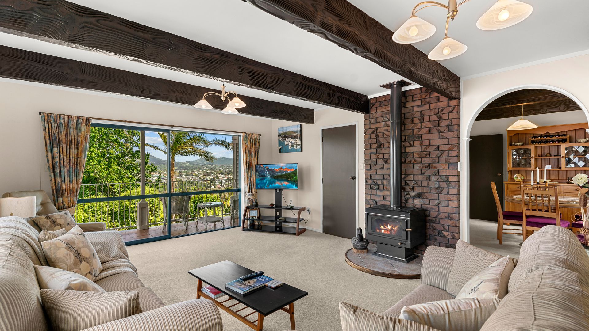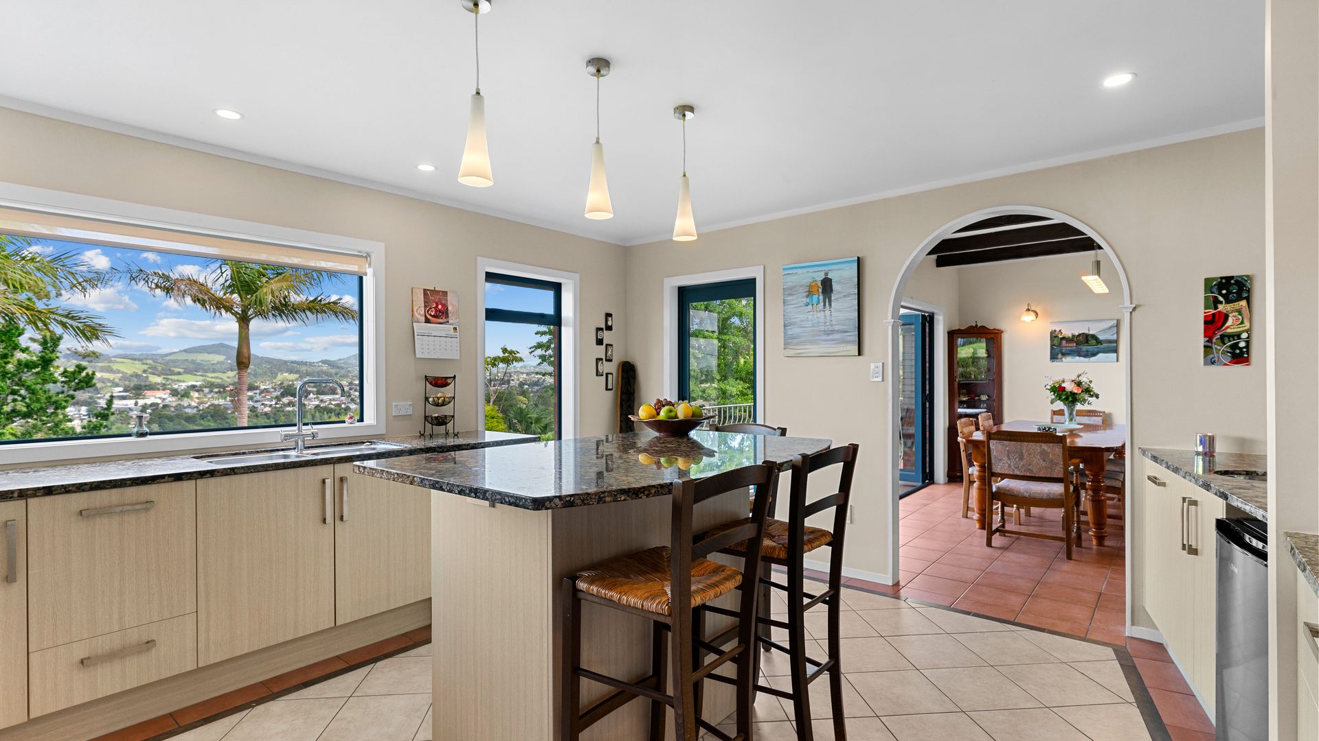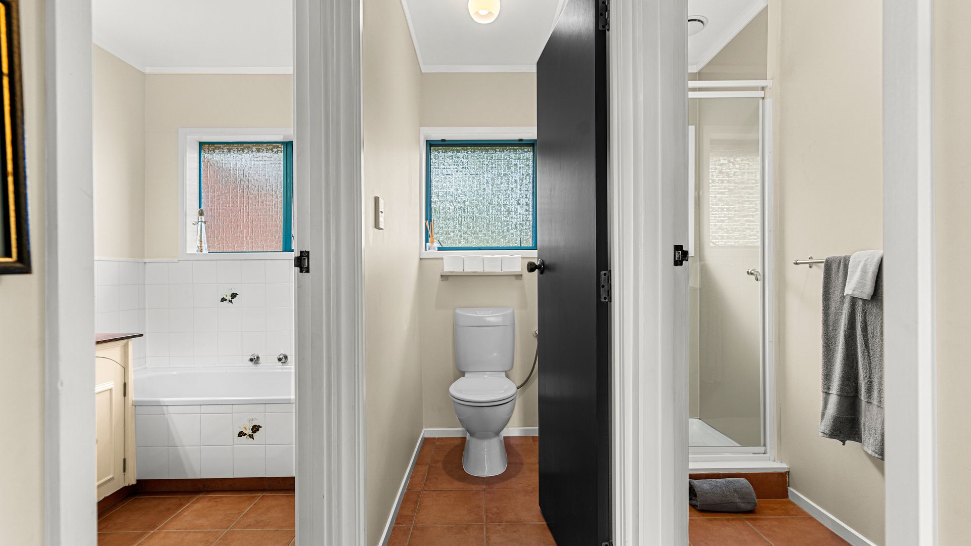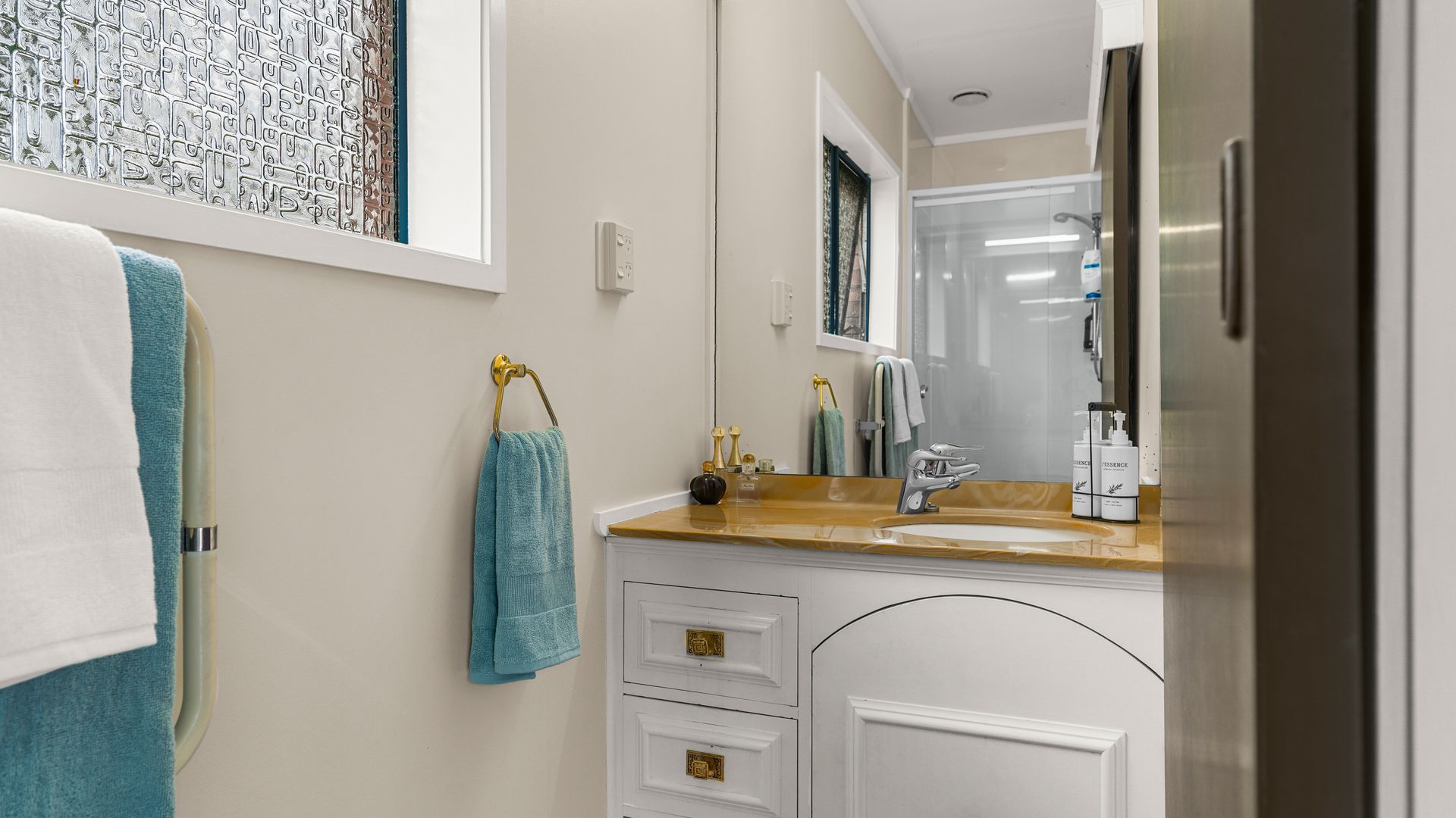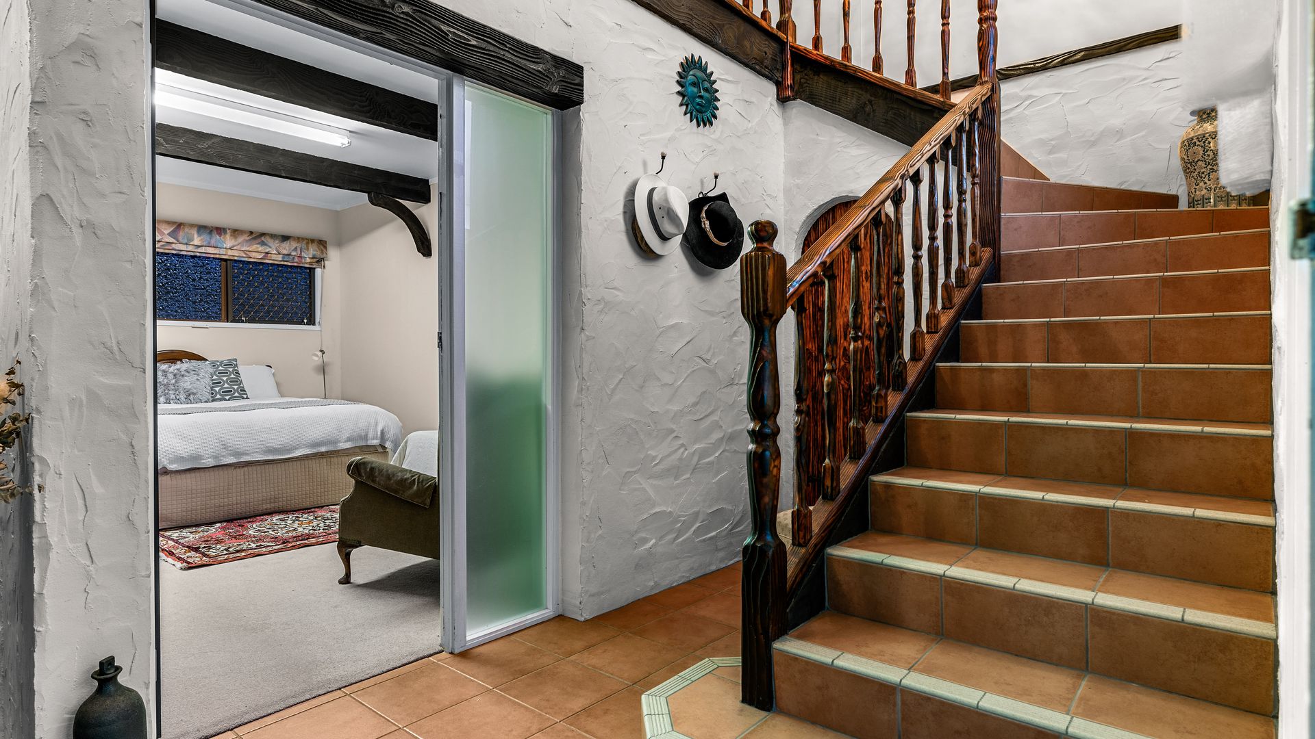 Upstairs, the main living level is warm, generous, and oriented to make the most of both light and view. Three well-proportioned bedrooms are supported by two bathrooms, including an ensuite off the master, while two separate living areas create natural separation between relaxed family living and entertaining. A modern kitchen anchors the space, the result of thoughtful renovation that sits comfortably within the home’s solid framework and connects seamlessly to the living areas and outlook beyond.