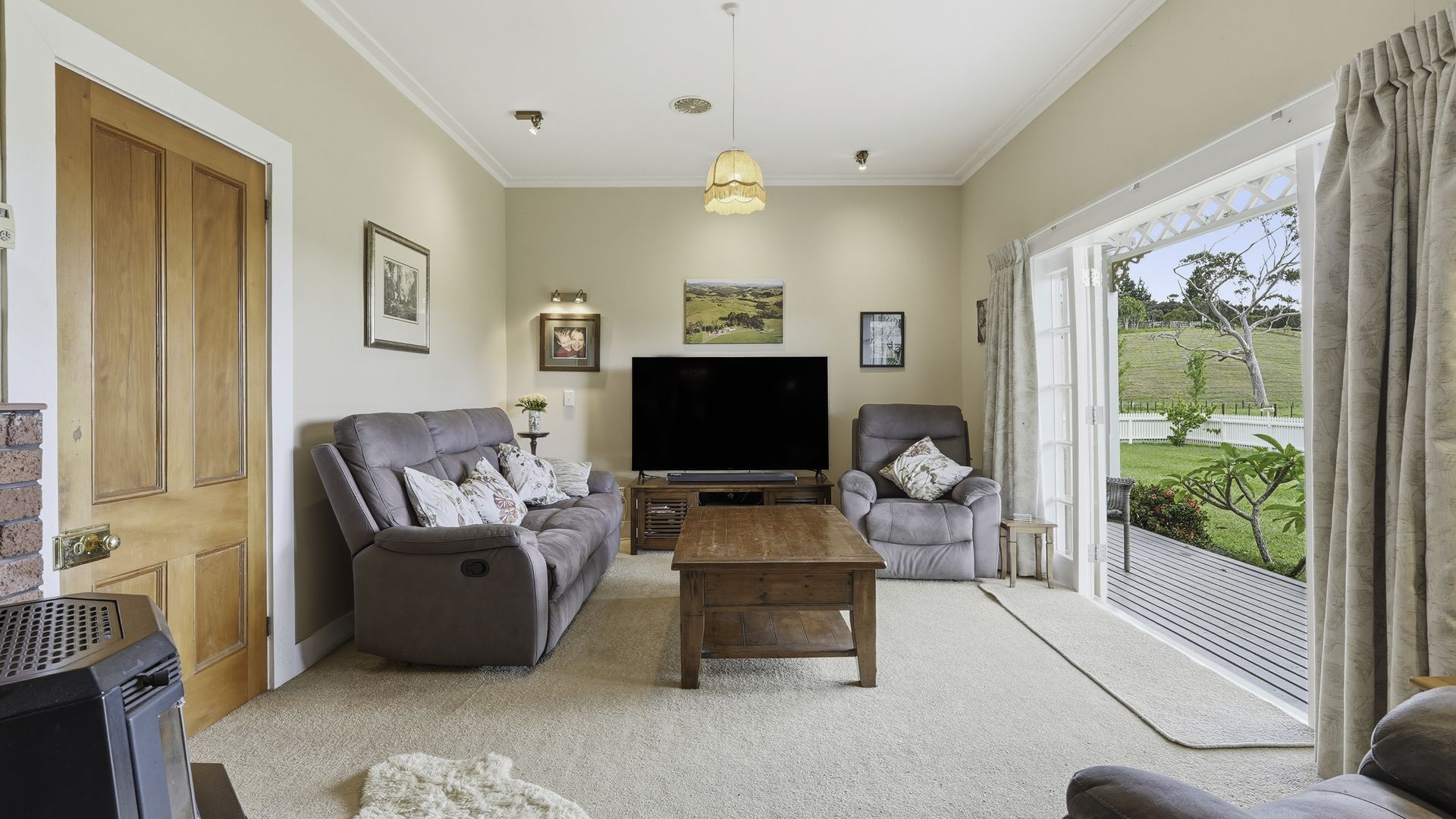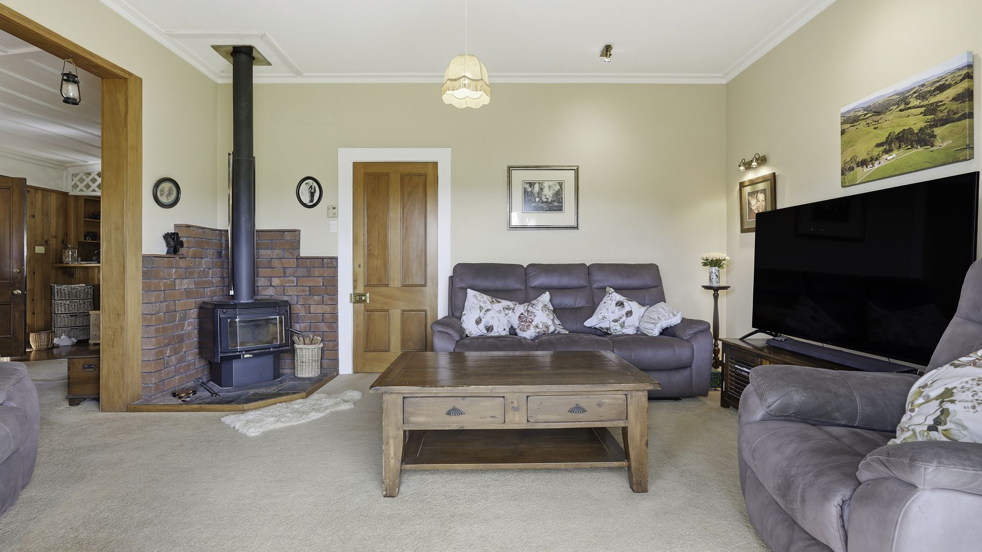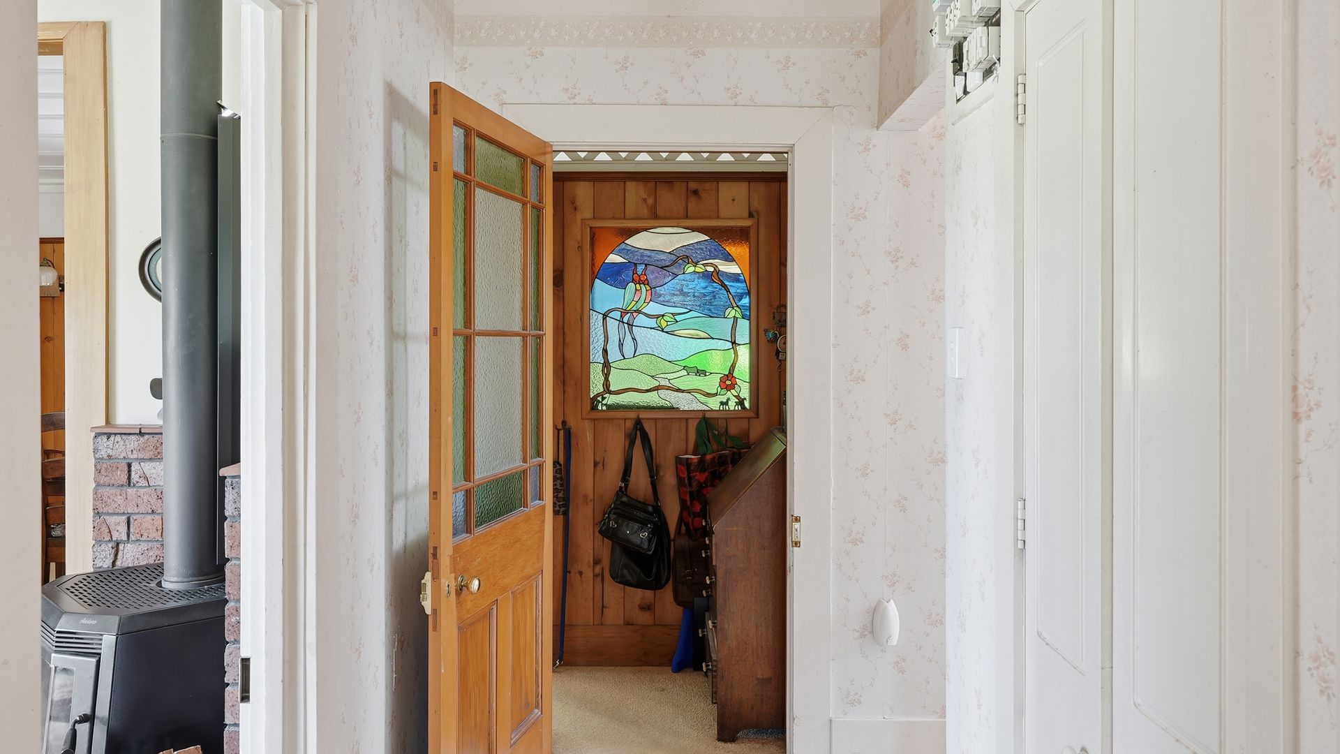 Inside, heritage is expressed with restraint and authenticity. High ceilings create rooms of scale, while native timber detailing and stained-glass accents enhance the home’s ambience. A wood burner grounds the space in warmth and everyday functionality. Living spaces are generous without being overstated, large windows and French doors draw the landscape naturally into daily life.