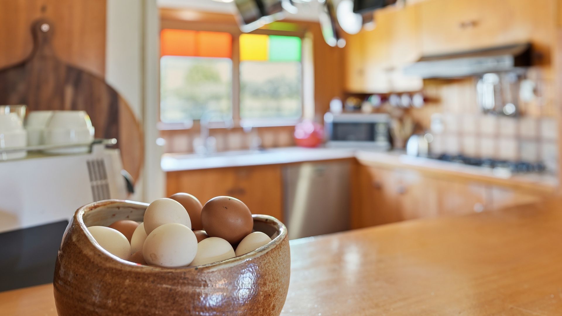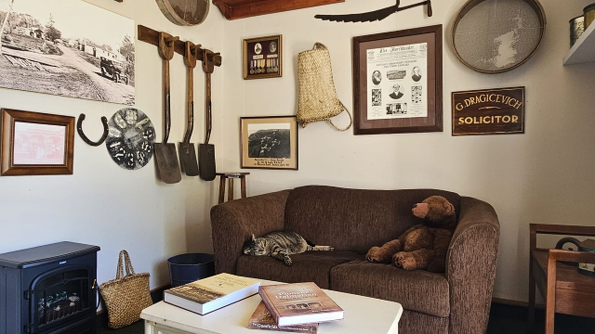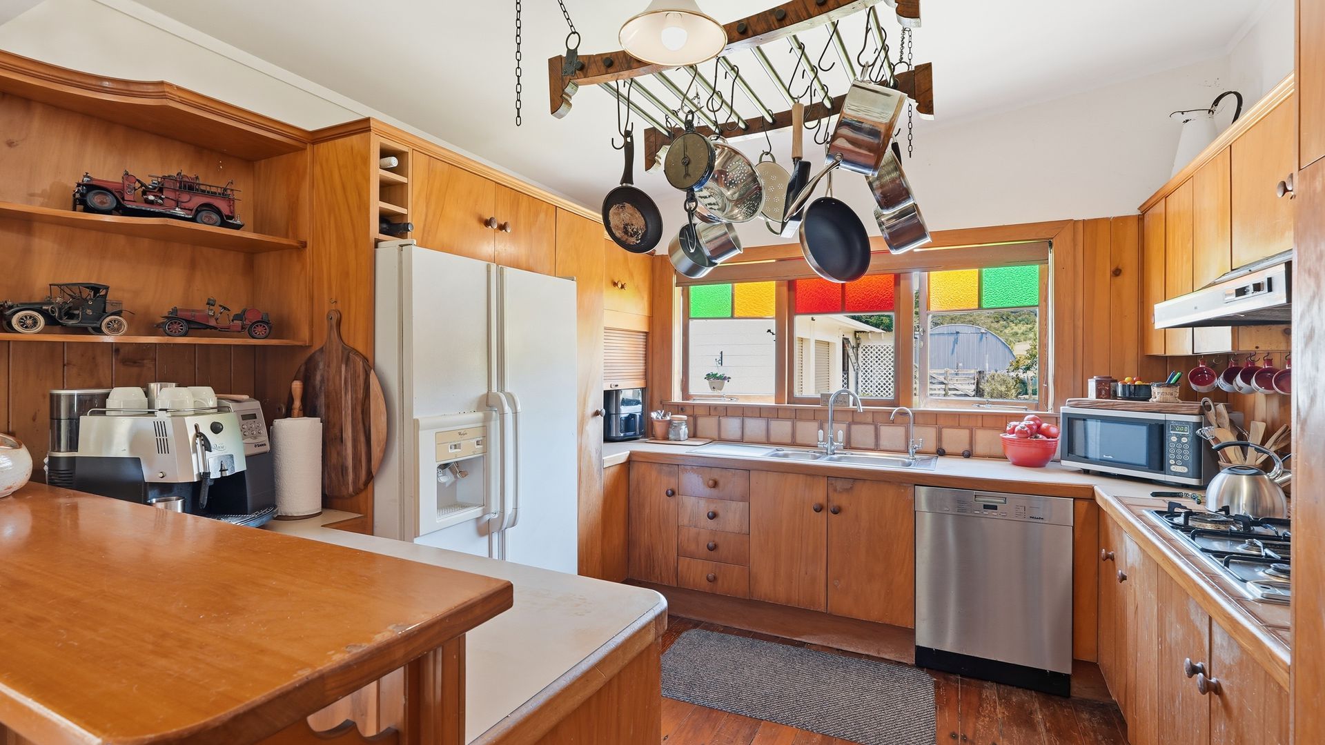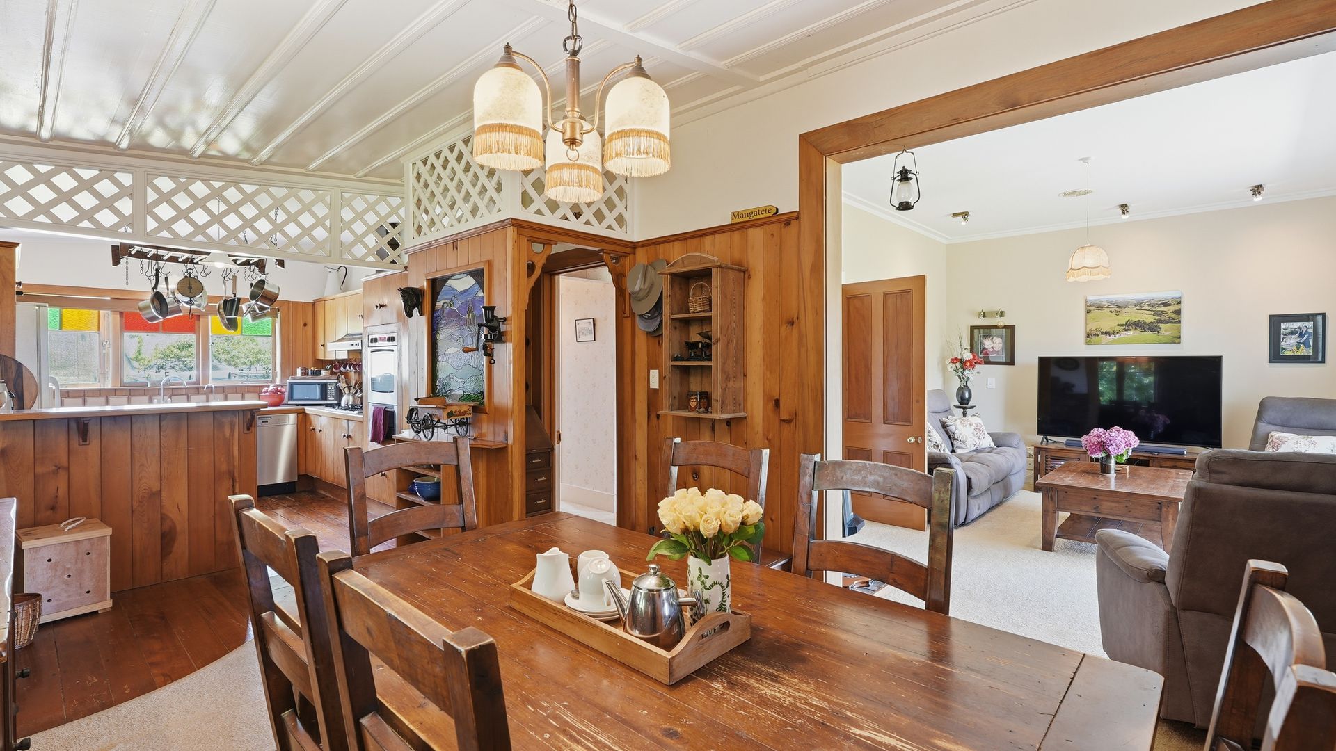 Inside, heritage is expressed with restraint and authenticity. High ceilings create rooms of scale, while native timber detailing and stained-glass accents enhance the home’s ambience. A wood burner grounds the space in warmth and everyday functionality. Living spaces are generous without being overstated, large windows and French doors draw the landscape naturally into daily life.